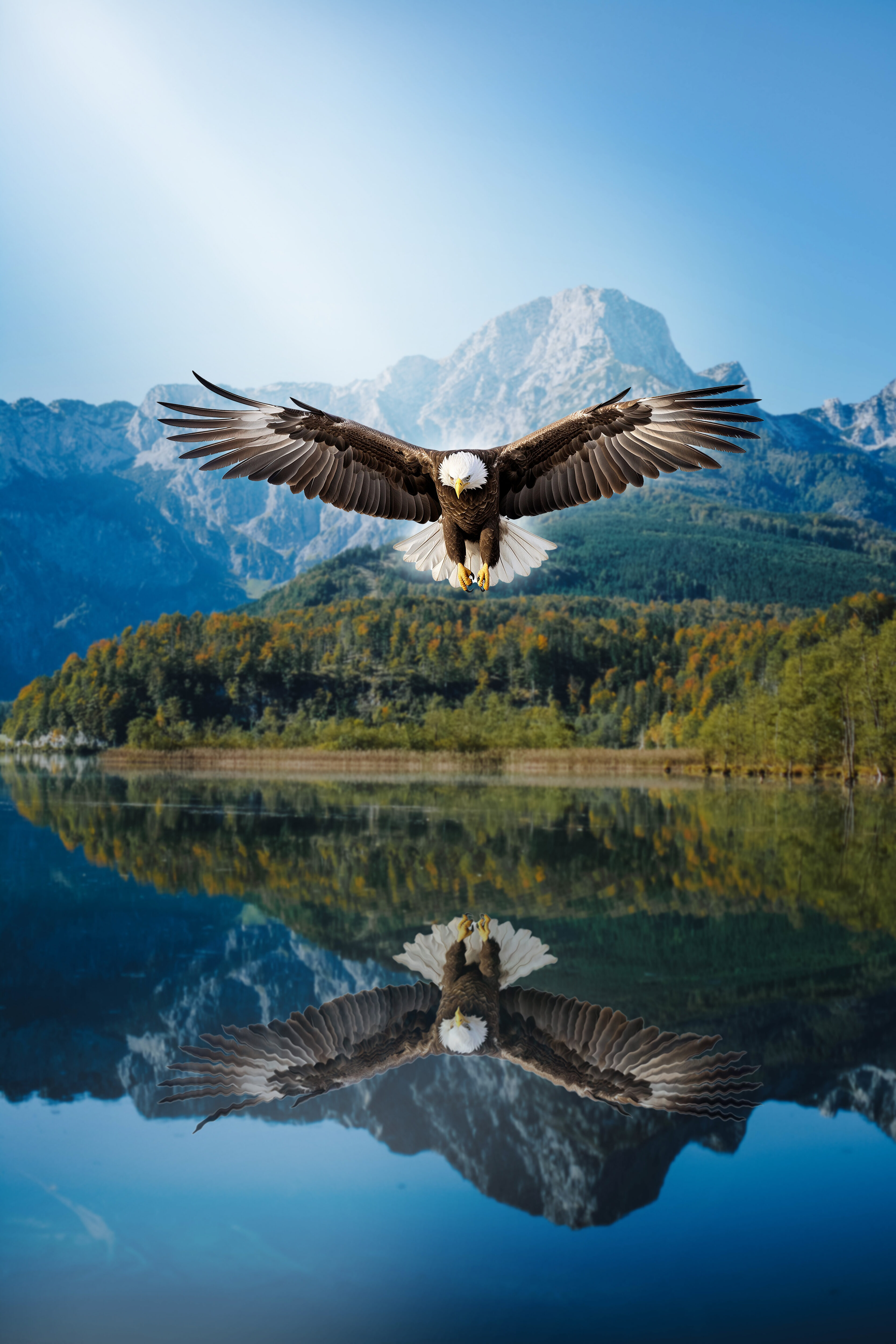 L’aigle voit apparaître son reflet dans le calme d’un lac.